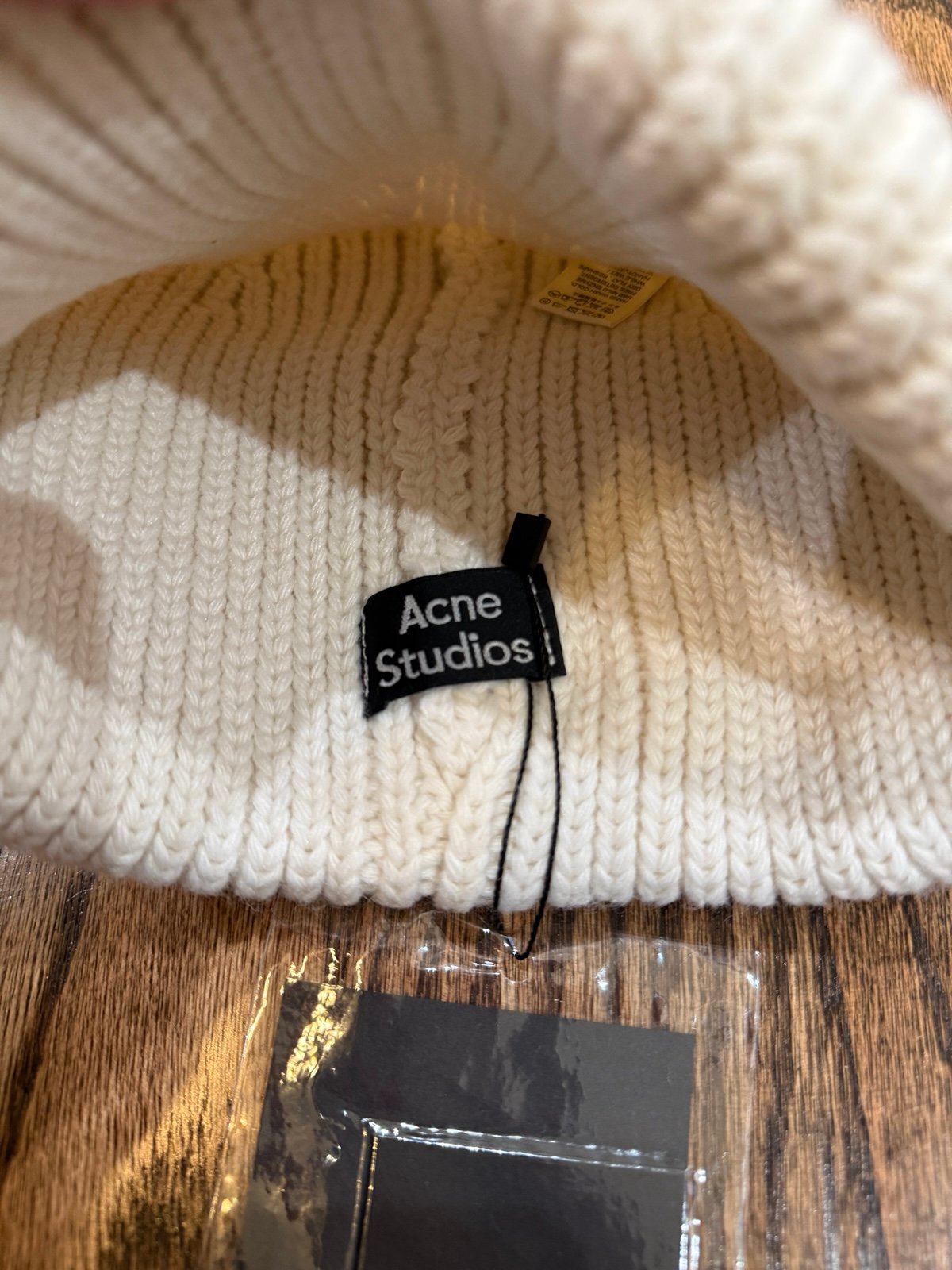 Knit beanie features a large embroidered face logo patch and ribbed detailing, crafted from chunky wool.